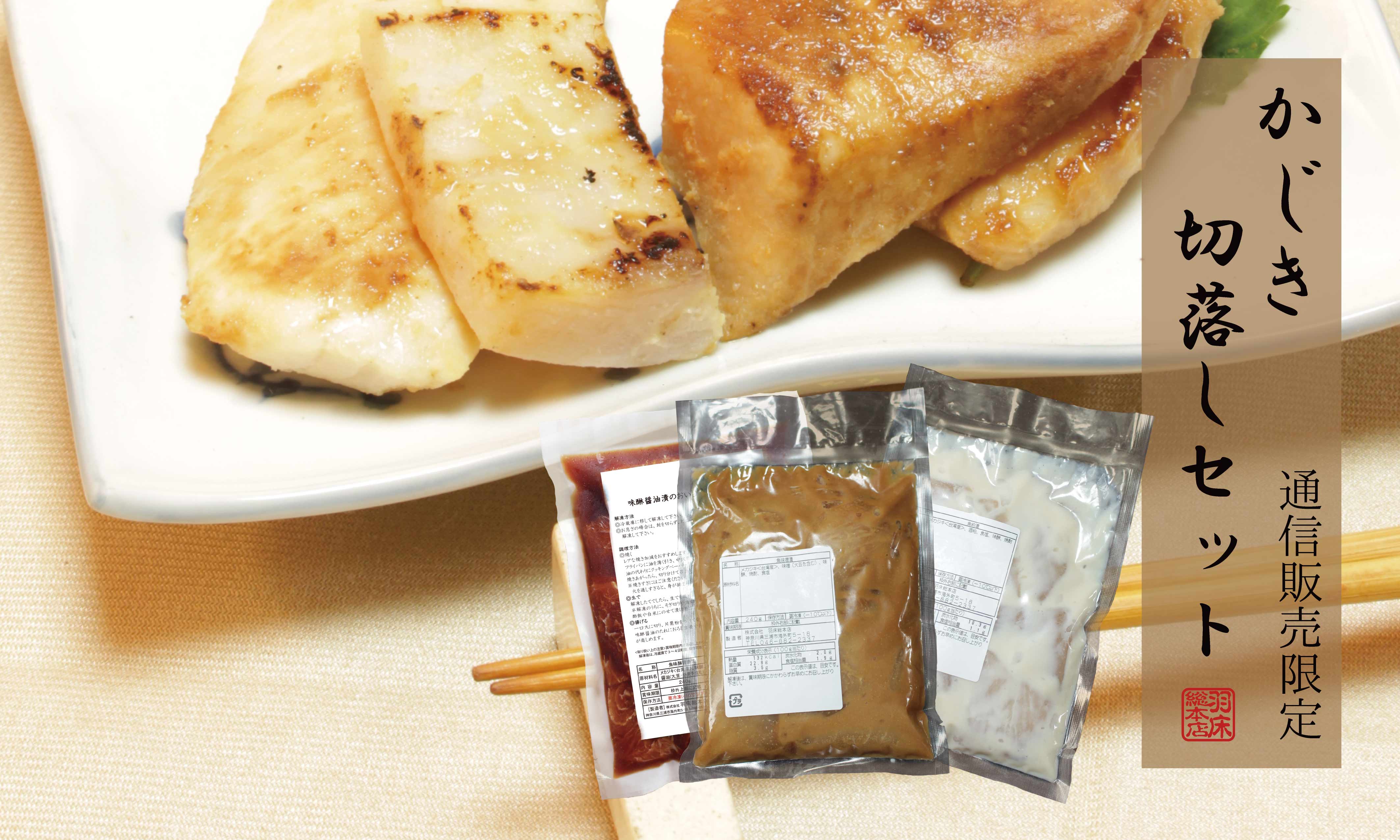ご自宅に簡単便利なお取り寄せ!年末の忙しい時に!赤身部分の味噌漬・粕漬・味醂醤油漬の羽床の定番品の切り落しを3種セットでお届けします。