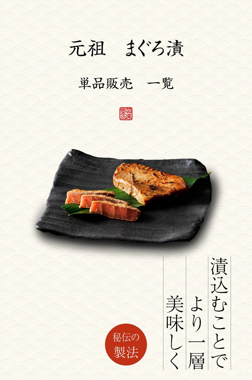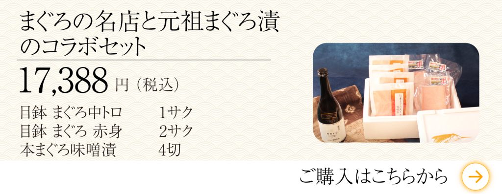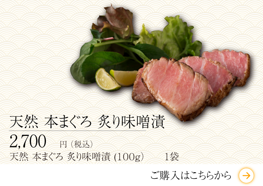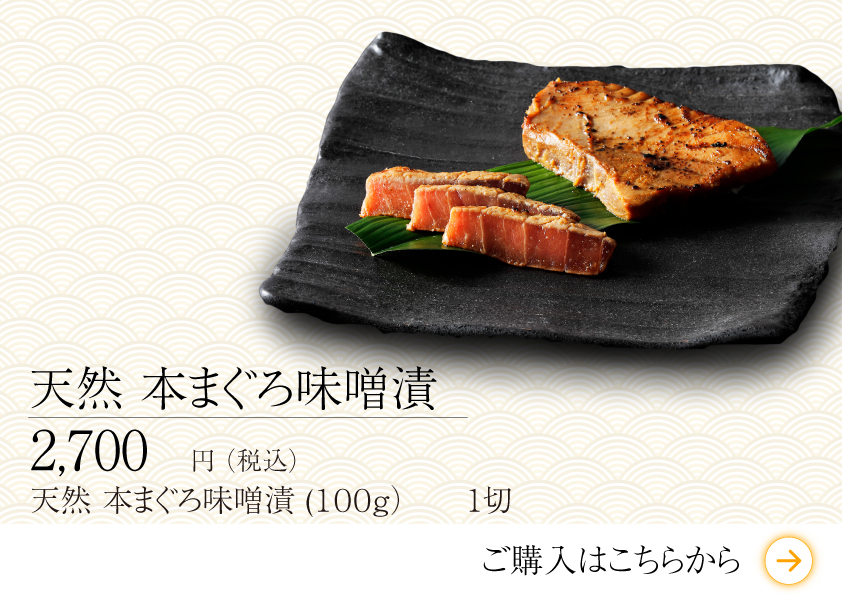 <味噌漬>刺身で食される本まぐろをの大トロ・背トロを贅沢に味噌漬にしました。味噌によって熟成された旨みが口の中に広がります。