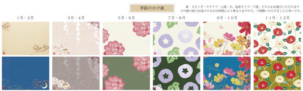 スタンダードタイプ(上段)か、色彩タイプ(下段)どちらかをお選びいただけます。どの掛け紙でお届けするかは時期により異なりますので、ご理解いただけましたら幸いです。